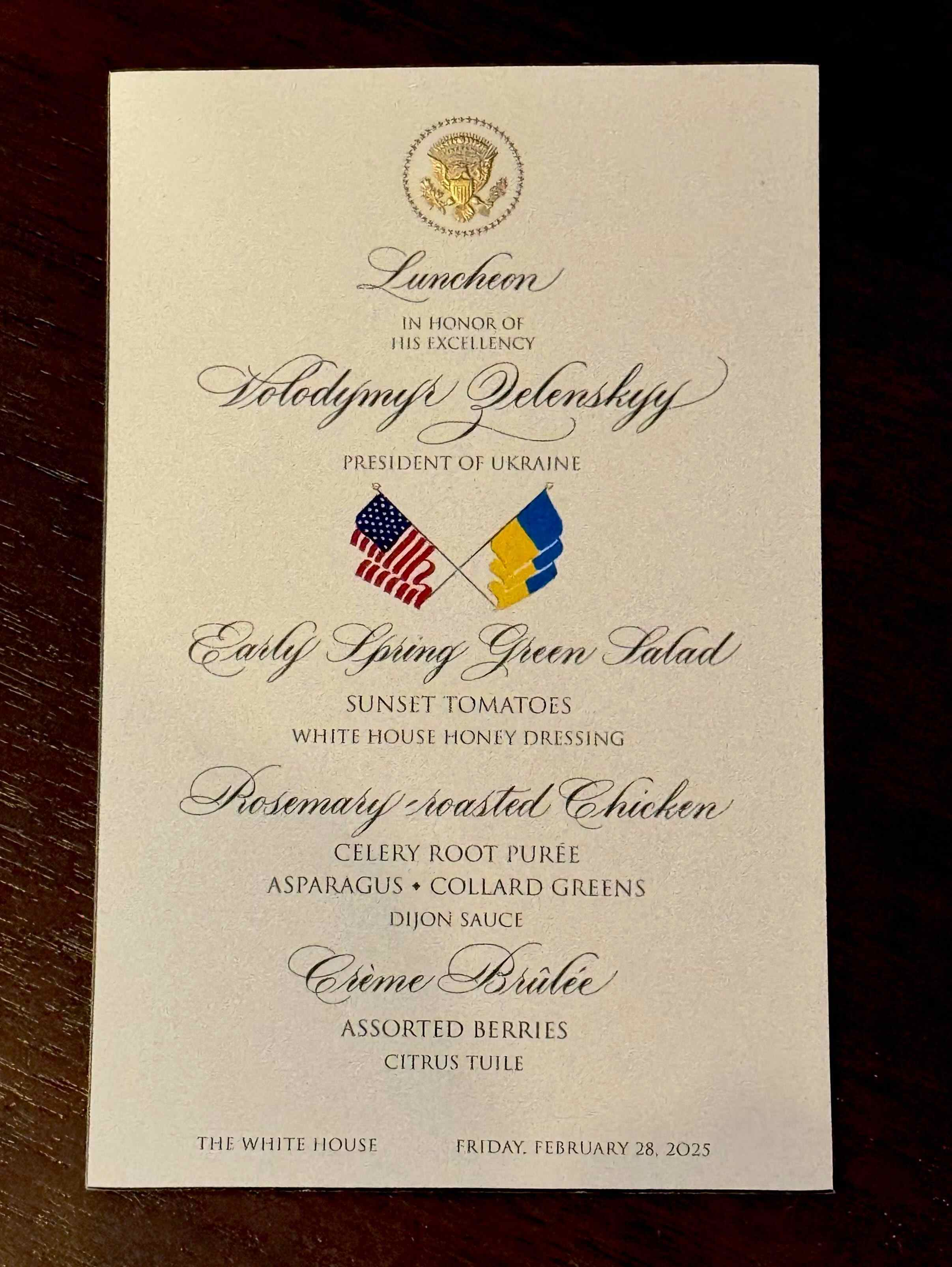 据《纽约时报》披露,特朗普继续享用为泽连斯基准备的午餐,吃了一道早春绿色沙拉、迷迭香烤鸡和焦糖布丁。特朗普的白宫办公厅副主任丹·斯卡维诺还在社交媒体上发布了菜单。