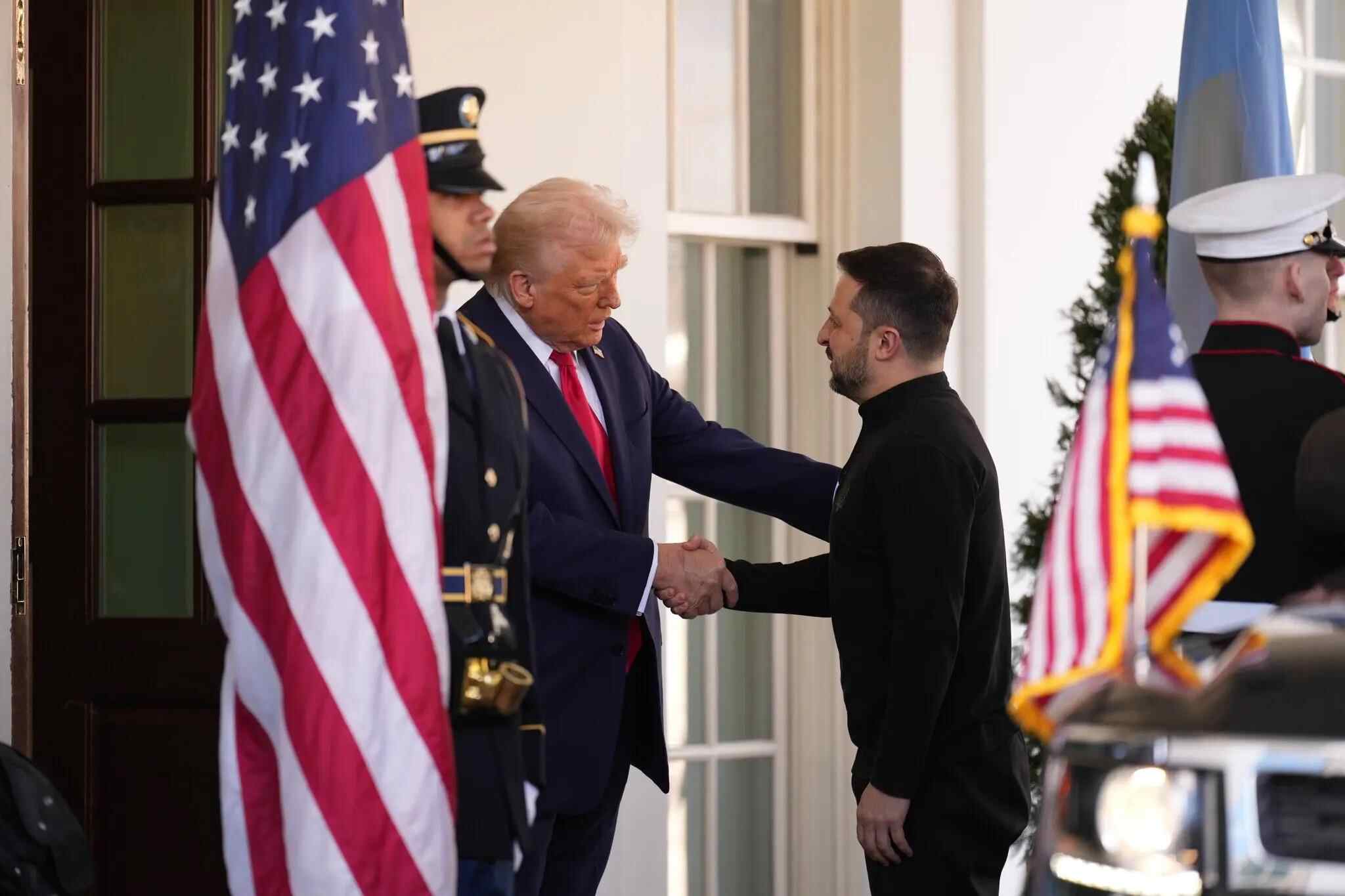 抵达白宫后,泽连斯基钻出黑色SUV,身着一身已成为他标准制服的行头——印有乌克兰传统三叉戟标志的黑色毛衣和类军式长裤。特朗普穿过西翼的走廊来迎接他。