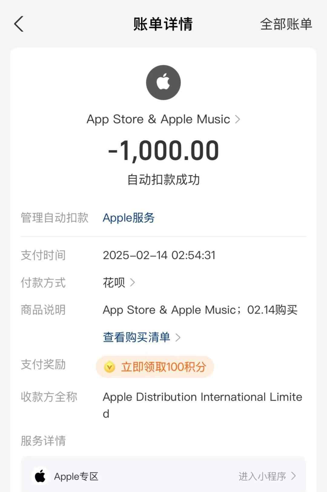 该客服进一步解释称,苹果手机进行免密支付时,系统实际上会优先从苹果账户余额中扣费,若苹果账户余额不足,再从绑定的支付渠道中扣费。“只是用户一般没有向苹果账户充值的习惯,因此支付时都会跳过这一环节,直接从微信、支付宝或者卡里扣款。”