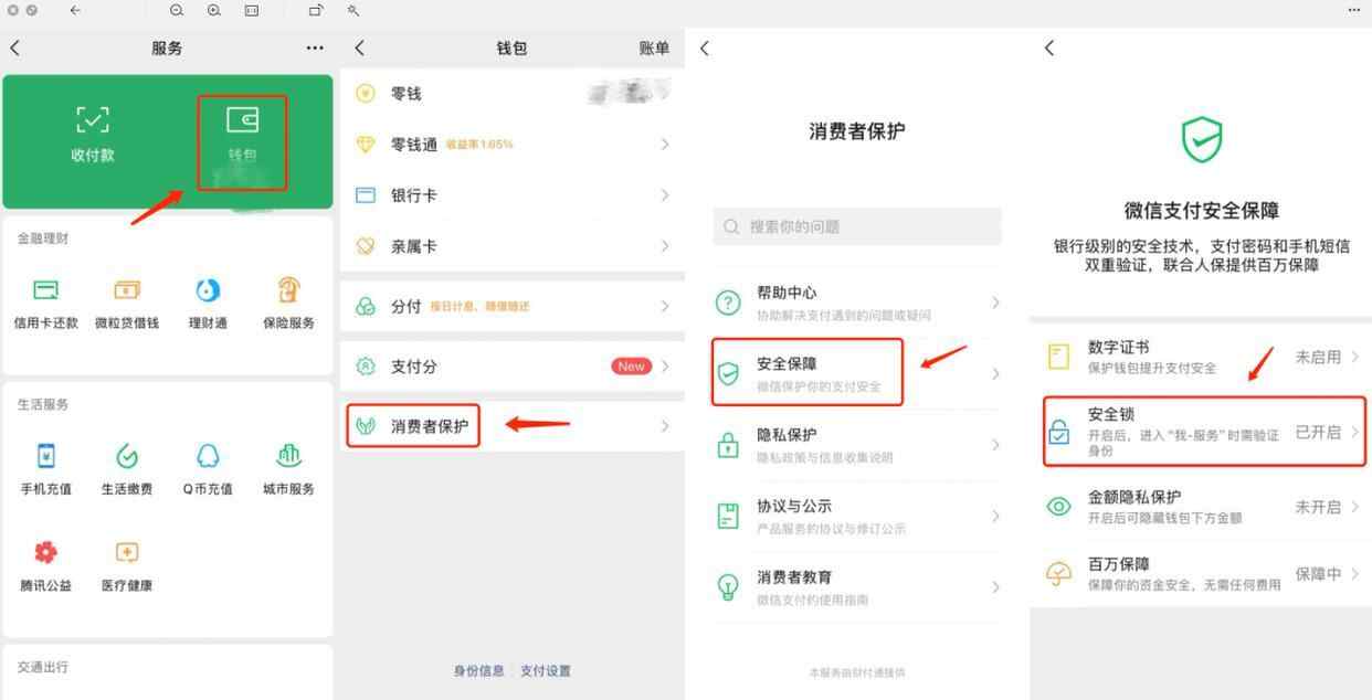 微信:点击“我”→进入“服务”→点击“钱包”→选择“消费者保护”中的“安全保障”→点击“安全锁”,选择相应的验证方式。