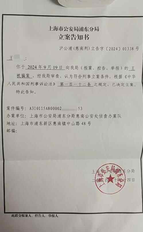 王女士提供的《立案告知书》显示,她曾于2024年9月19日晚到上海公安局浦东分局民乐城派出所报案被骗一案,同年10月14日,该分局认为符合刑事立案条件已立案。