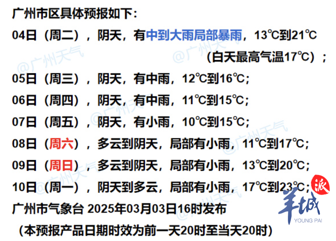 预计3月4日,广州市区白天最高气温回落至17℃。持续风雨降温,广州市区将会在3月7日迎来过程最低气温10℃。