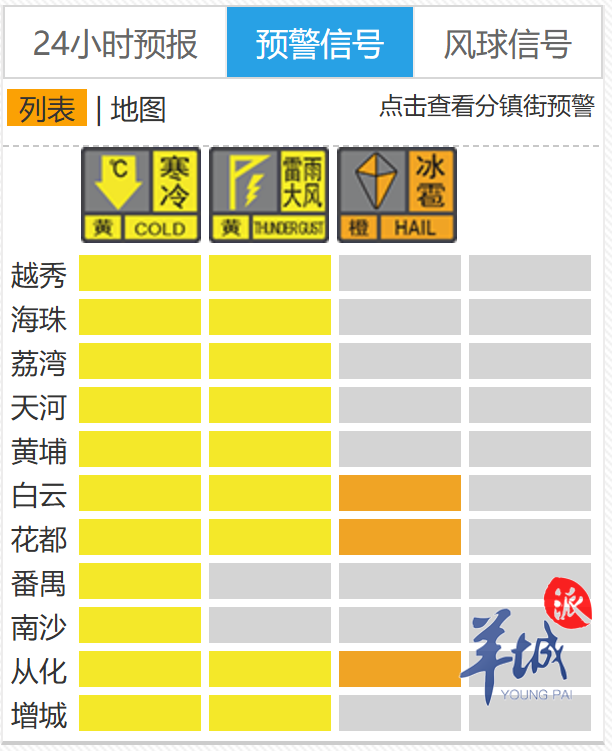 截至3月3日18时50分,广州同时发布寒冷、雷雨大风、冰雹三款预警信号。其中,广州各区均已发布寒冷黄色预警信号;除番禺、南沙外,其余各区均发布雷雨大风黄色预警信号;白云·、花都、从化三区发布冰雹橙色预警信号。