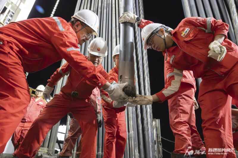 深地塔科1井钻探作业工作人员从井底提出钻头。图/中国石油集团提供