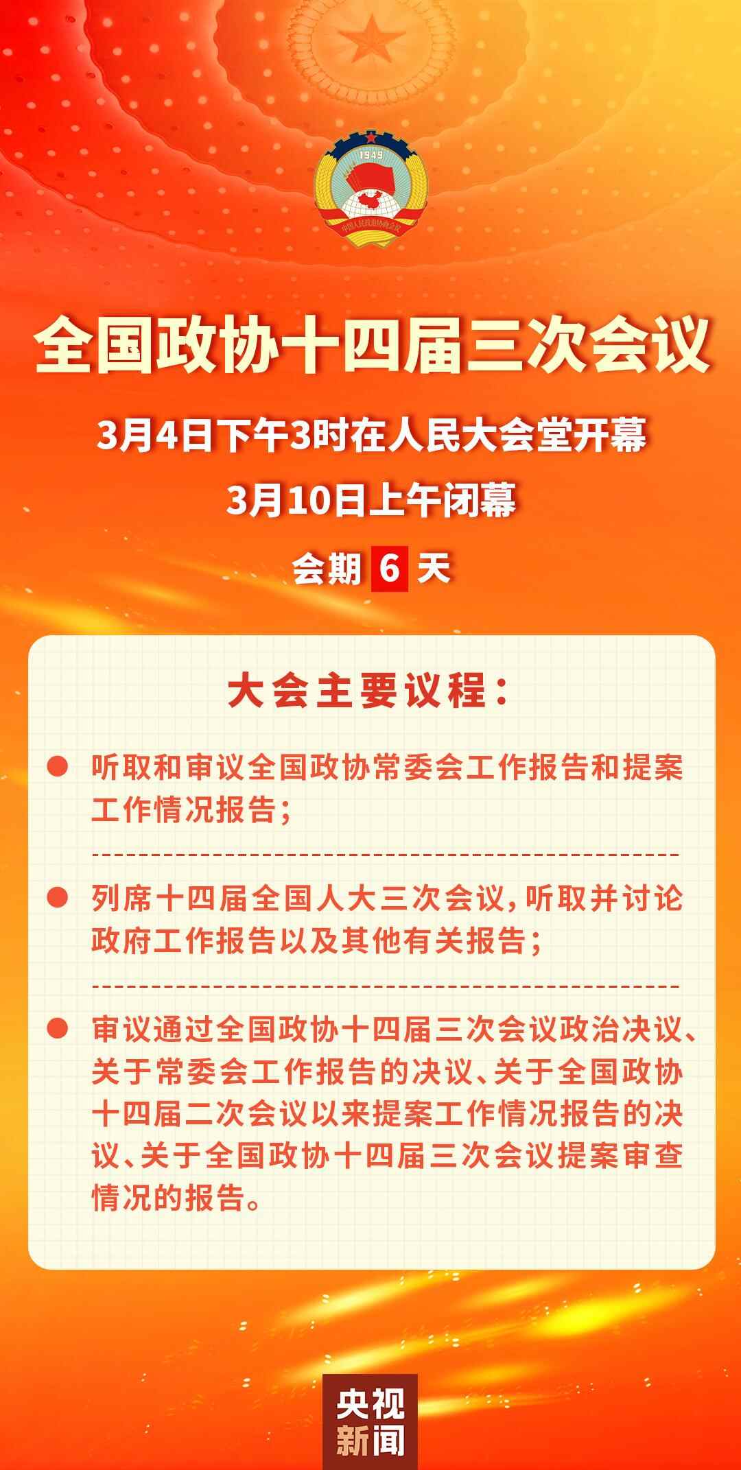 全国政协十四届三次会议将于3月4日下午3时在人民大会堂开幕,3月10日上午闭幕,会期6天。