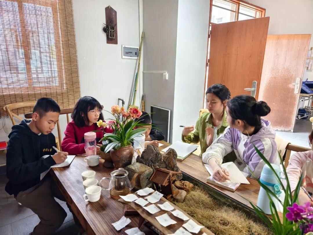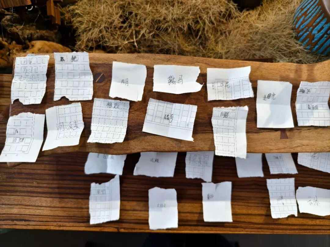 今天,在茶室,给同学们上课。一开始让同学们轮流背一首古诗,背完之后给同学们发了两张小纸片。每张纸片写一个词,其中一个词语要选自刚刚自己背诵的古诗,另外一个词不做要求,可以是动物、植物、建筑等等,如果实在想不到也可以看看周边有什么事物。