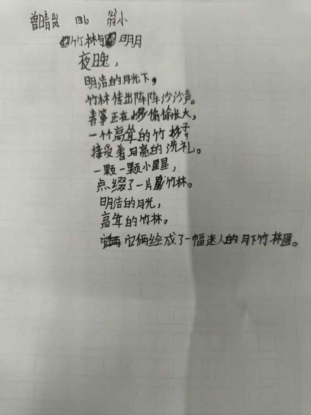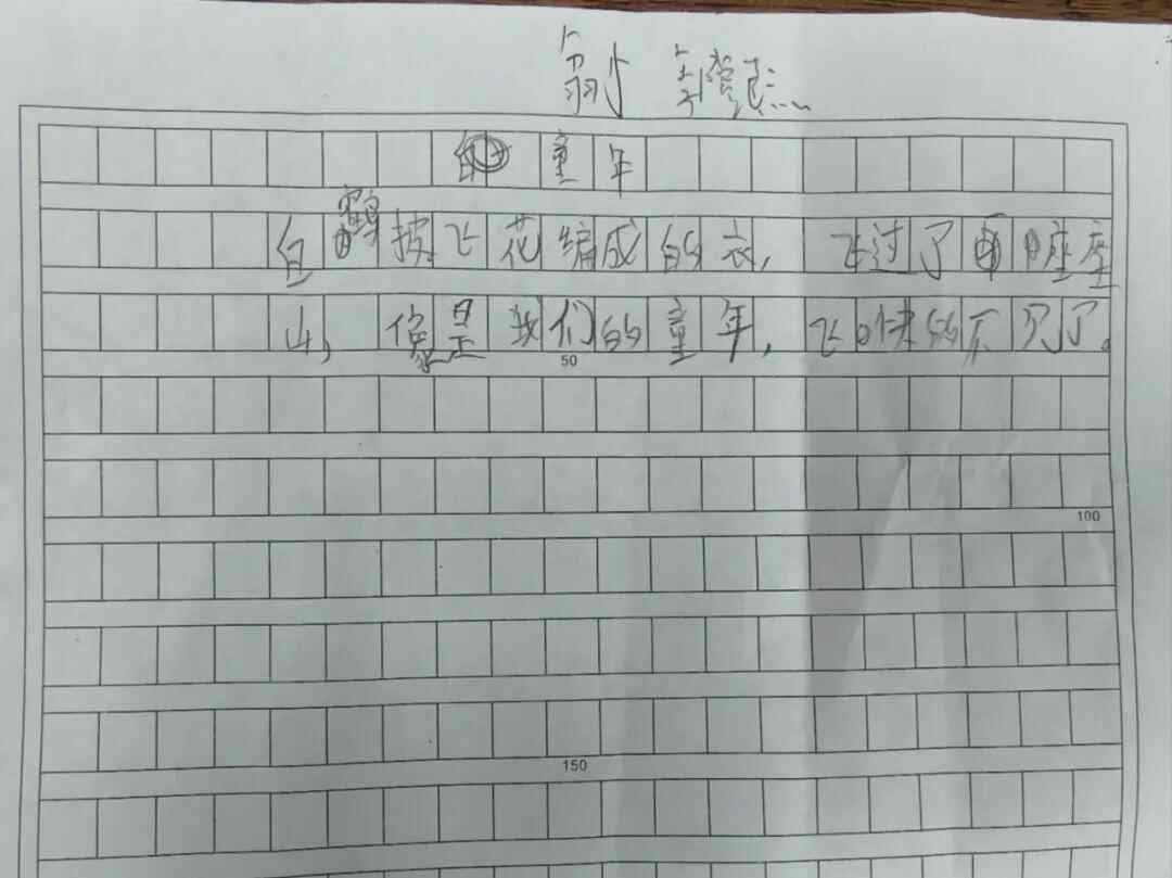 “连词成句”的练习结束之后,同学们就开始写诗了。我和大家说,我们刚刚说的那些句子,大家可以展开往下写,这样就可以写成一首诗。当然,词语和句子都不限定于刚刚说的那些,如果有另外的想法,也可以据此创作。看了同学们这次交上来的作品,我觉得同学们又有新的进步,创作就是要多想、多读、多写。