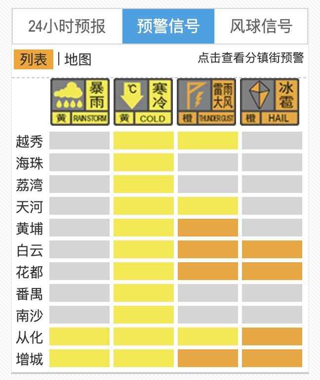 截至3月4日9时25分,广州各区维持发布寒冷黄色预警信号,白云、花都、从化、增城发布冰雹橙色预警信号,从化、增城发布暴雨黄色预警信号,黄埔、白云、花都、增城发布雷雨大风橙色预警信号,越秀、天河、从化发布雷雨大风黄色预警信号。不排除广州各区后续继续发布或者调整预警信号。