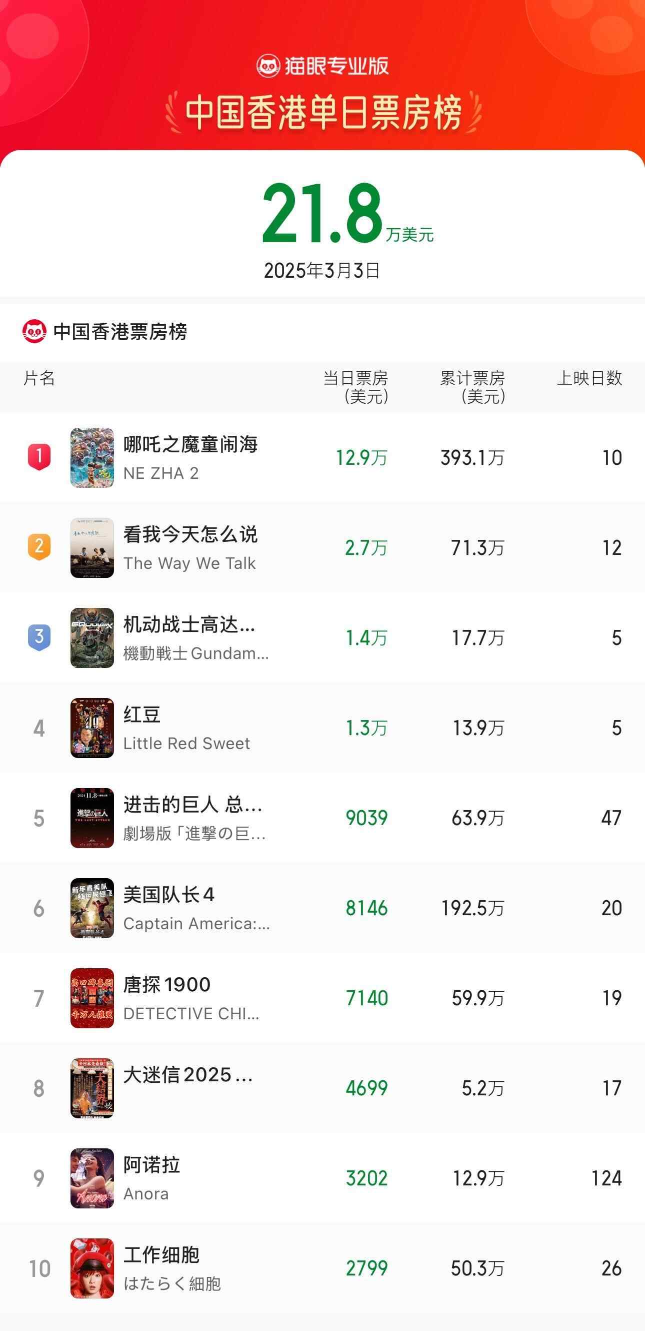 据网络平台数据显示,电影《哪吒之魔童闹海》中国香港上映10天,连续10天登顶中国香港单日票房榜,截至当前中国香港累计票房已超393.1万美元,成为中国香港及澳门影史内地电影票房冠军。