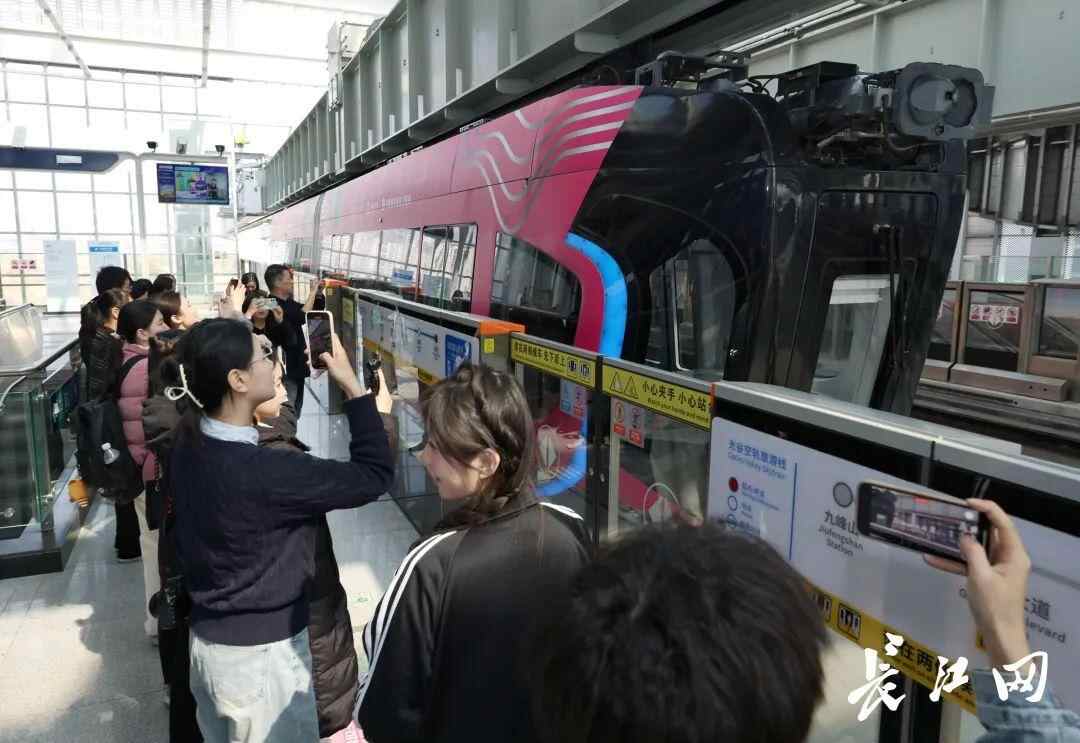 社会实践团成员纷纷拿出手机记录每一辆造型不同的空轨列车。王筝 摄