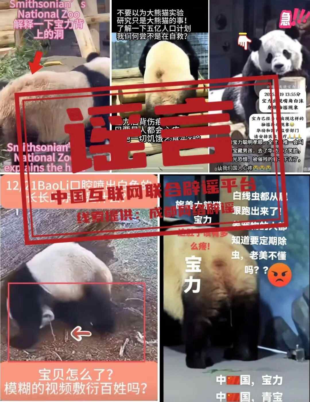 真相:经核实,大熊猫“宝力”背部下方毛发因坐着吃东西压覆而形成凹凸状况,并非网传的“洞”。目前,大熊猫“宝力”和“青宝”食欲正常,健康状况良好。