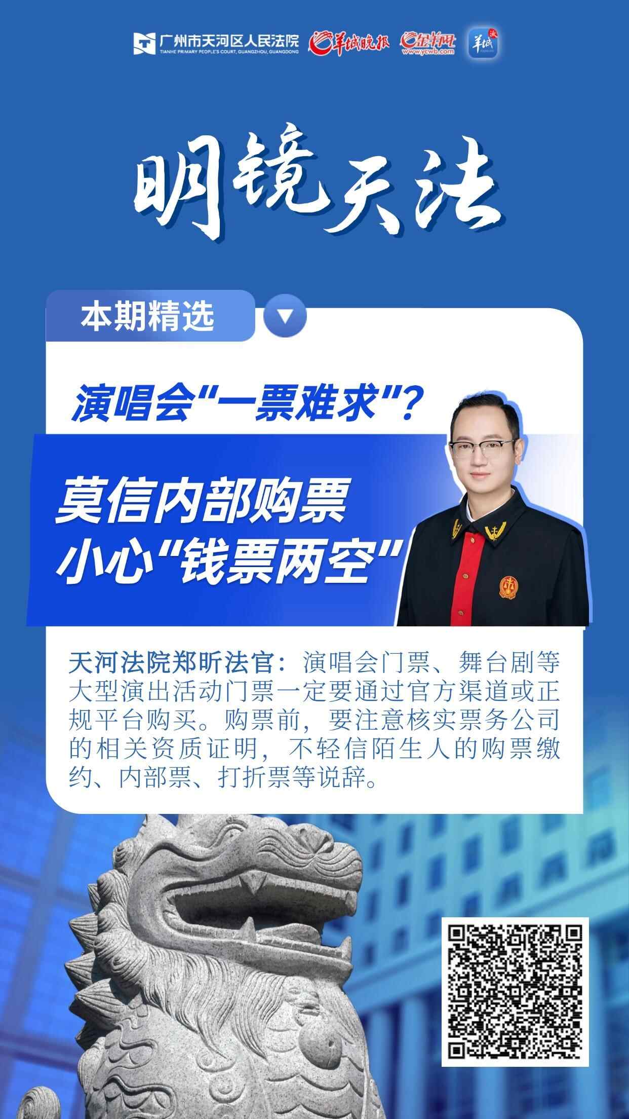 天河法院刑事审判庭郑昕法官提醒,近年来,随着演出市场爆火,很多知名歌手的演唱会频频“开票即售罄”。粉丝们为了能与偶像见面各显神通,通常都会向“黄牛”高价购票,先行预付高价票款,动辄数千元、数万元。然而,这种做法不仅会助长“黄牛”抢票、炒票的歪风,还可能会陷入骗子制造的“内部购票骗局”。
