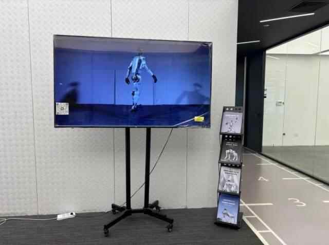 新公司目前尚未贴出公司名称和标识,不过公司门口放置着一面电视屏幕,循环播放着宇树科技人形机器人G1的产品宣传片,旁边还放着一系列产品介绍册。