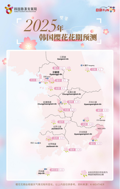 在韩国,樱花的开放预示了春天的到来。最新出炉的预测显示,2025年樱花花期预计比去年普遍提前3-8天。从最早花开的济州岛(3月22日)开始,釜山(3月23日)、首尔(4月1日)、江原道江陵(4月1日)等地区将依次拥抱蓓蕾初绽。通常全盛花期在开花后一周左右到来,因此济州与首尔分别在3月29日和4月8日前后迎来赏樱的最佳时机。