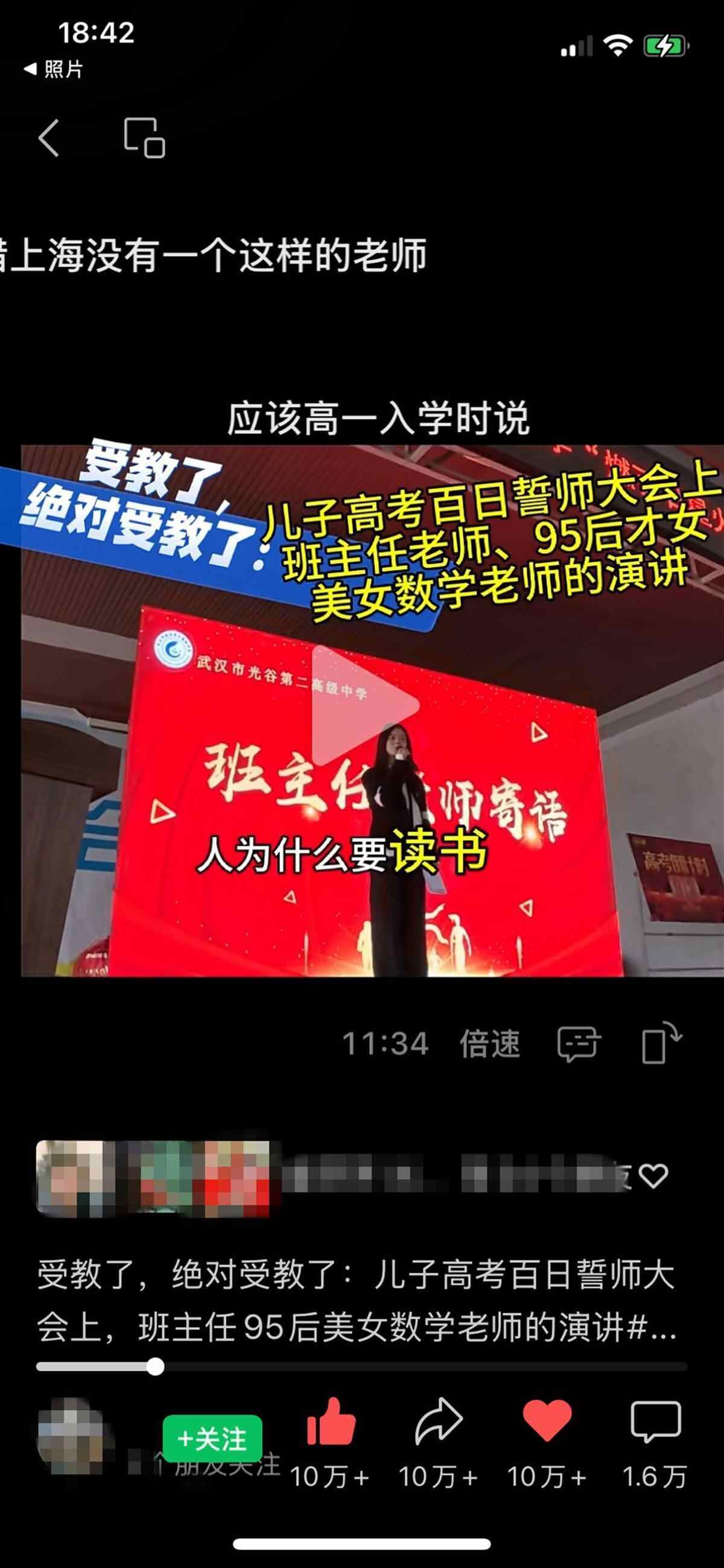 3月5日深夜,当武汉市光谷第二高级中学高三(4)班严同学的父亲在个人视频号、抖音号上发出儿子的班主任、数学教师匡已聪在当天学校的高三百日誓师大会上的演讲全篇时,他绝对想不到,这成了3月6日全网最火视频:点赞过百万。