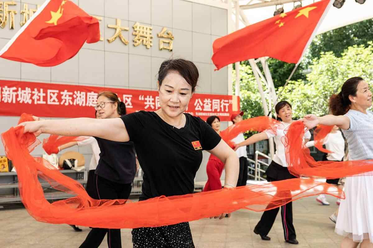 在东湖新城社区大舞台,由15名社区居民组成的舞蹈队正在彩排舞蹈《我和我的祖国》。(湖北日报全媒记者 任勇 摄)