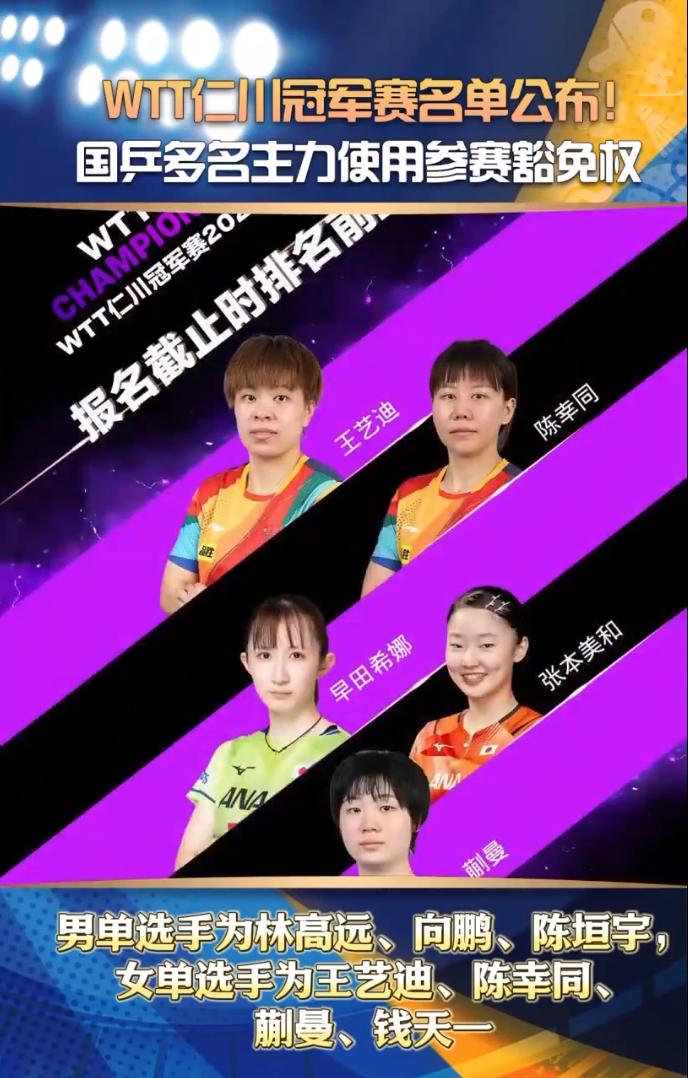 今日WTT仁川冠军赛名单公布,国乒男单选手林高远、向鹏、陈垣宇,女单选手王艺迪、陈幸同、蒯曼、钱天一参赛,王楚钦、林诗栋、孙颖莎、王曼昱等多名主力使用参赛豁免权选择不参赛。