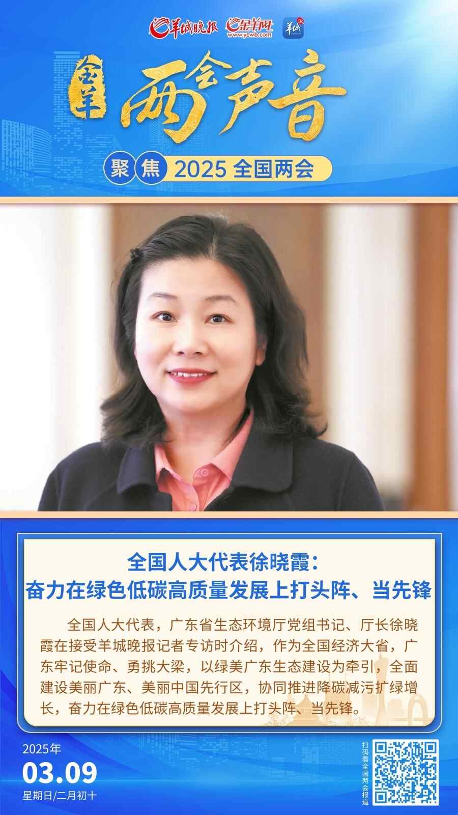 2025年政府工作报告提出,协同推进降碳减污扩绿增长,加快经济社会发展全面绿色转型。广东持续推动生态环境建设,有哪些具体部署?全国两会期间,全国人大代表,广东省生态环境厅党组书记、厅长徐晓霞在接受羊城晚报记者专访时介绍,作为全国经济大省,广东牢记使命、勇挑大梁,以绿美广东生态建设为牵引,全面建设美丽广东、美丽中国先行区,协同推进降碳减污扩绿增长,奋力在绿色低碳高质量发展上打头阵、当先锋。