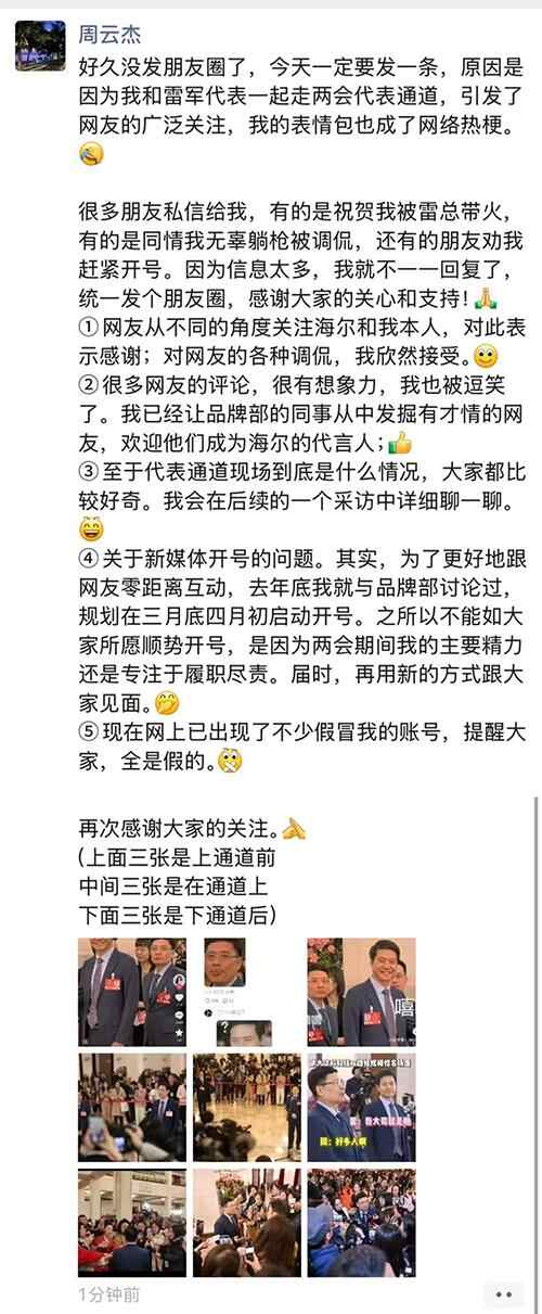 3月7日,周云杰在朋友圈对网络爆火作出回应,“好久没发朋友圈了,今天一定要发一条,原因是因为我和雷军代表一起走两会代表通道,引发了网友的广泛关注,我的表情包也成了网络热梗。很多朋友私信给我,有的是祝贺我被雷总带火,有的是同情我无辜躺枪被调侃,还有的朋友劝我赶紧开号。因为信息太多,我就不回复了,统一发个朋友圈,感谢大家的关心和支持!