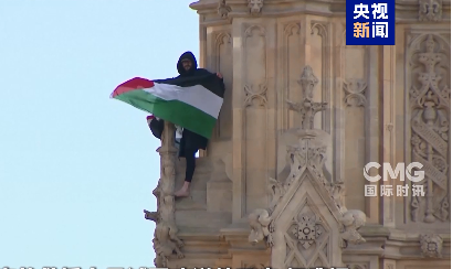 男子持巴勒斯坦旗帜爬上英国大本钟滞留16小时