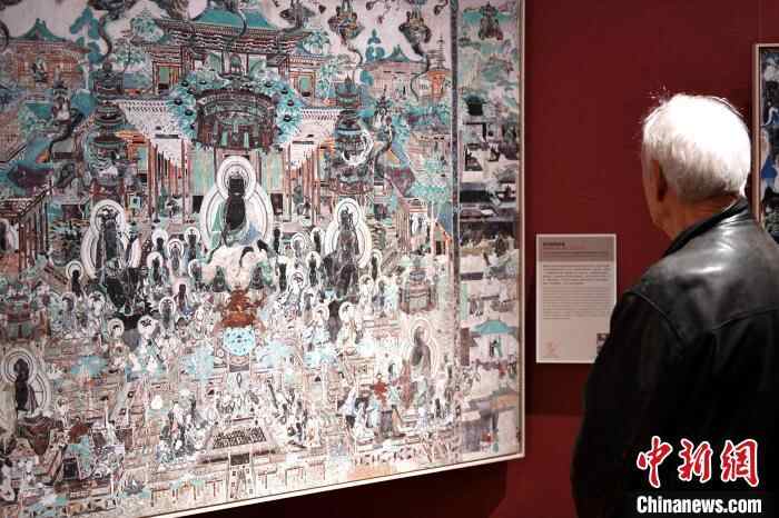 2024年10月25日,“丝路宝藏 文明交响”敦煌石窟艺术巴黎特展在巴黎中国文化中心揭幕。展览使用数字技术手段再现敦煌石窟的辉煌。图为观展者在观赏展品。 中新社记者 李洋 摄