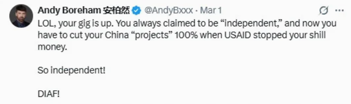 “笑死,你们人设崩了。”在中国生活和工作多年的新西兰媒体人安迪·博勒姆(中文名安柏然)也嘲讽道,“成天标榜自己‘独立’,现在美国国际开发署断了黑钱,对华‘项目’得100%砍光。还真是独立啊!赶紧凉透吧!”