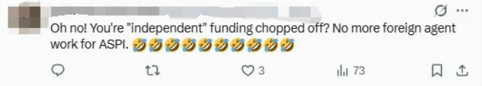 “哦豁!‘独立智库’的资金被切断啦?ASPI这下做不成外国代理人的勾当咯。”