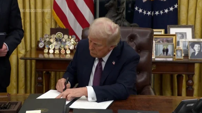 当地时间1月20日,特朗普签署行政命令,要求暂停美国所有对外援助计划。 美联社视频截图