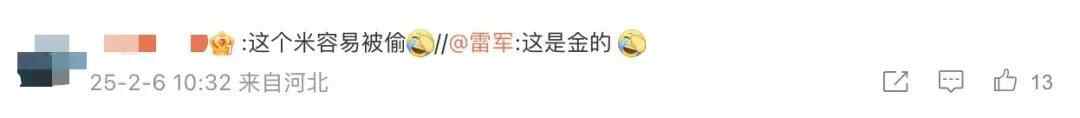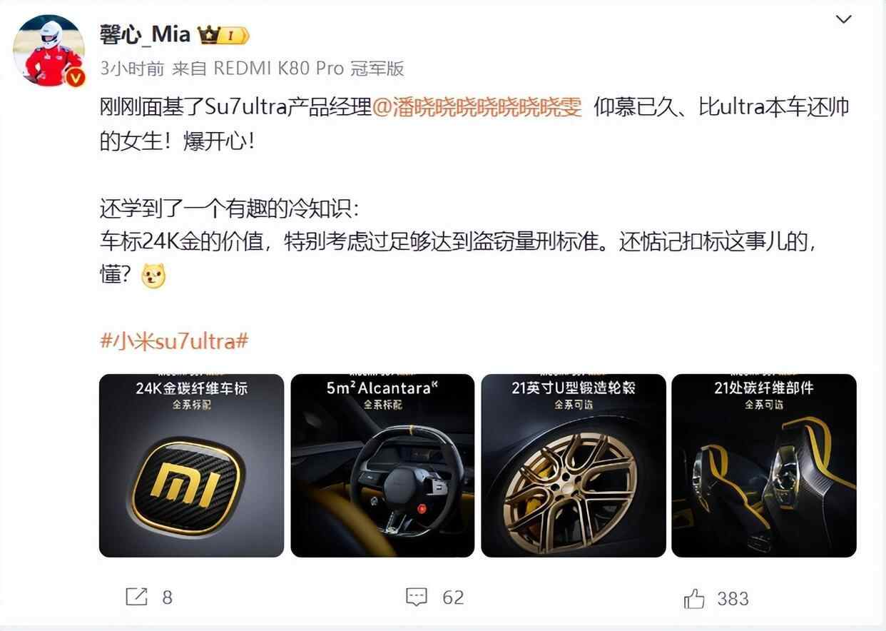 2月26日,小米REDMI产品经理胡馨心介绍,她从小米SU7 Ultra产品经理那里了解到,小米SU7 Ultra车标24K 金的价值,特别考虑过足够达到盗窃量刑标准,不要惦记抠车标这事。
