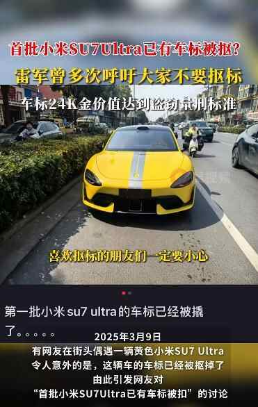 3月9日,有网友在街头偶遇一辆黄色小米SU7 Ultra,令人意外的是,这辆车的车标已经被抠掉了,由此引发网友对“首批小米SU7Ultra已有车标被扣”的讨论。