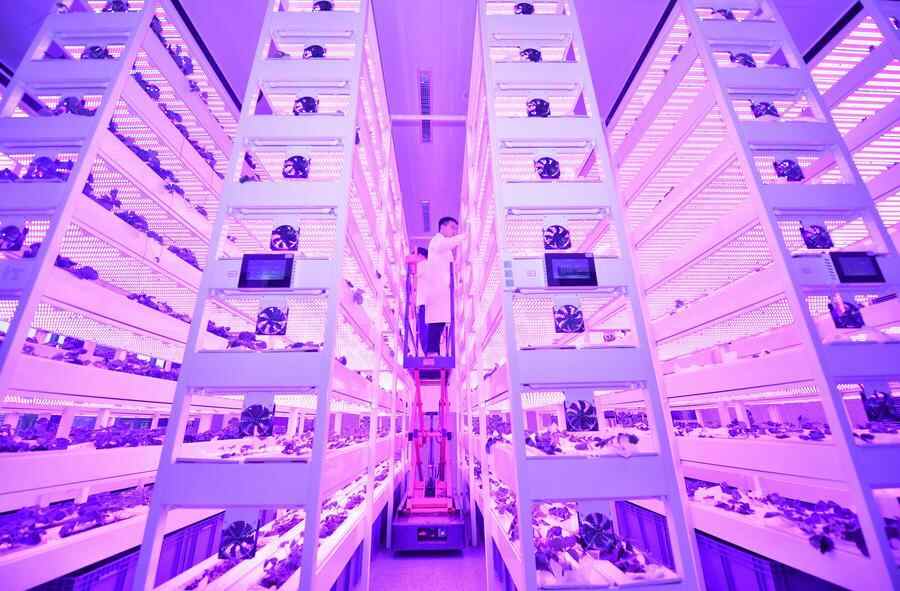 科技人员在中国农业科学院都市农业研究所智能植物工厂观察农作物生长情况(2024年10月16日摄)。新华社记者 刘坤 摄