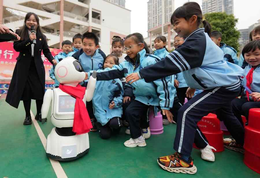 2025年2月17日,广西南宁市邕宁区龙岗北小学的学生与AI智能机器人亲密互动。新华社发(马华斌摄)