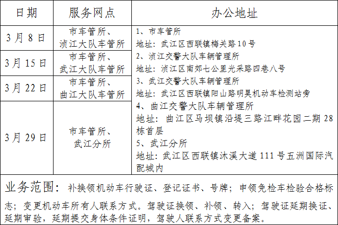 3月1日起,每周六、日(法定节假日除外)推行车驾管业务“周末办”便民服务。