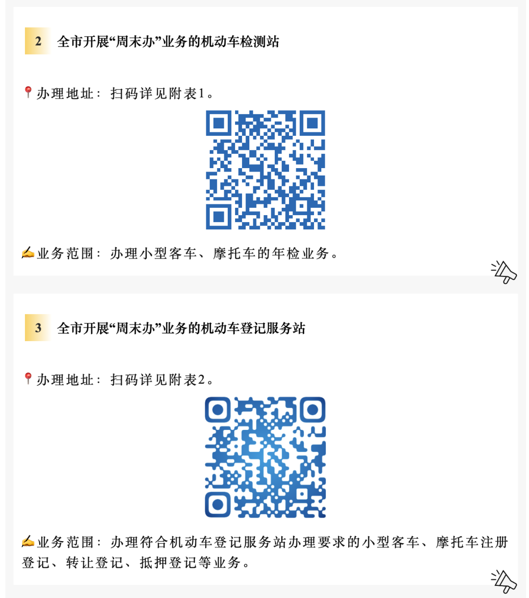 需到机动车检测站、机动车登记服务站“周末办”业务的请按下图二维码中的联系方式提前联系。
