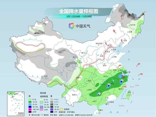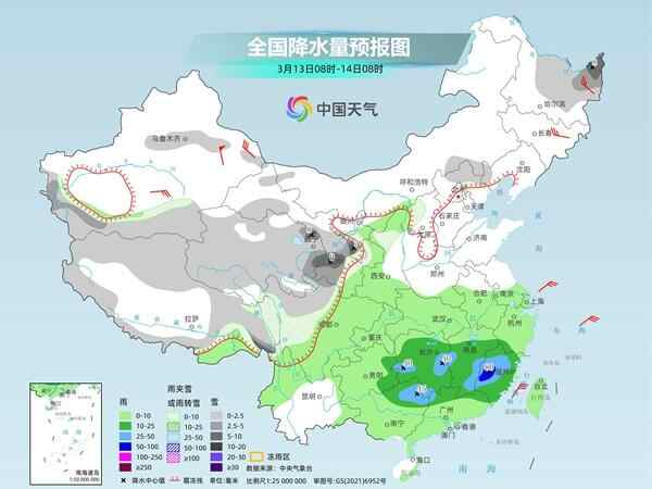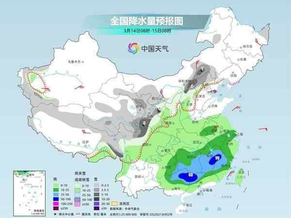 后天,内蒙古西部和南部、甘肃中南部、青海南部、西藏东部、川西高原、宁夏、陕西北部、山西中北部、河北北部等地部分地区有小到中雪或雨夹雪,其中,内蒙古南部、甘肃西南部、宁夏南部、山西北部、川西高原北部等地部分地区有中到大雪。西北地区东南部、西南地区东部、黄淮南部、江淮、江汉、江南、华南中北部等地部分地区有小到中雨,其中,广西东北部、广东北部、湖南南部、江西中南部、福建西北部等地部分地区有大雨或暴雨。