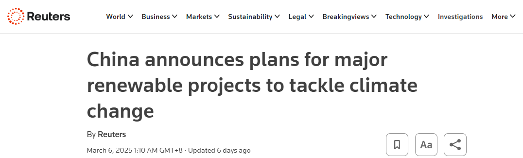 据路透社报道,中国政府5日宣布,将推出一系列重大可再生能源项目,力争在2030年前实现二氧化碳排放峰值,并在2060年达成碳中和目标。