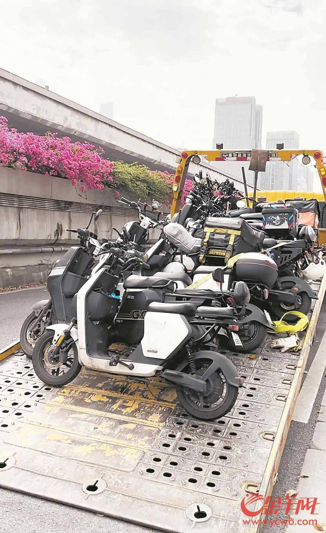 执法现场,多辆电动自行车被查扣。广州市公安局交通警察支队指挥中心陶警官介绍,有3类电动自行车或被查扣,分别是:非法改装、加装且车主拒不恢复或现场无法恢复原状的车辆;电动自行车有3宗及以上违法记录,且车主逾期不接受处理的车辆;无广州市登记的有效号牌,违法上路的电动自行车。