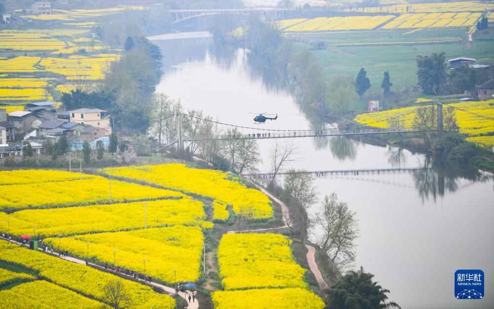 3月12日,游客乘坐直升机在重庆潼南崇龛花海景区游览。