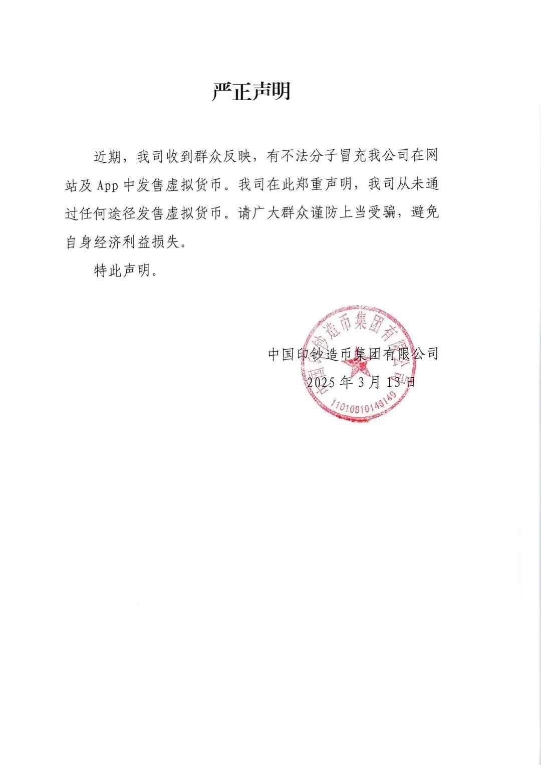 3月13日,中国印钞造币集团有限公司发布声明: