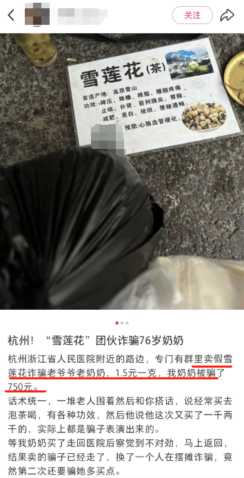 今年1月,浙江湖州吴兴的刘女士在路边花609元买了“雪莲花”,刘女士事后觉得上当了报警。随后浙江吴兴警方打掉了一个专门针对老年人的诈骗团伙。这个团伙打着卖“名贵花茶”的口号,将几十元一公斤的普通花茶用高价出售给老年人。
