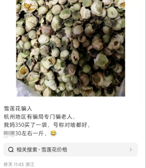 除了杭州、吴兴,浙江海宁也有市民报料:有人在街边高价贩卖“雪莲花”,号称“这是来自天山雪山之巅“圣药雪莲”,具有降血压、降血糖、降血脂以及睡眠不好等功效。”摊位前围满了人,多数是老年群体,不少人正打算购买。