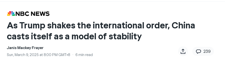 外媒称,中国的年度会议为世界提供了一个窗口,展示其稳健治理及政策规划一致性,与美西方的不可预测性形成鲜明对比,尤其是美国政府的政策不断削弱其国际声誉之时。