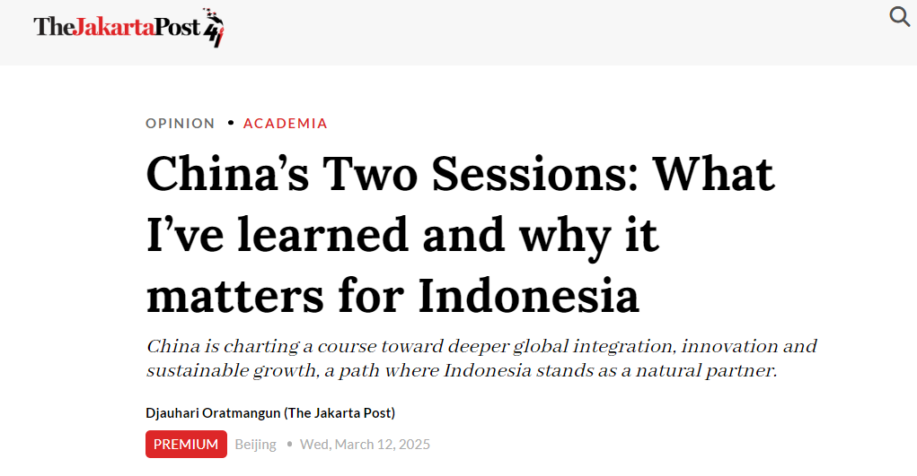 印尼《雅加达邮报》刊发印尼驻华大使周浩黎(Djauhari Oratmangun)的署名文章称,面对全球不确定性,中国通过两会展现了稳健的政策制定和前瞻性战略规划,凸显其作为世界第二大经济体的责任与担当。