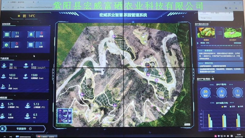 “温度14℃,气压1033hpa,风速3m/s,一切正常。”在紫阳县宏威富硒农业科技有限公司的办公室里,生产负责人江其林正通过智慧茶园管理大屏查看茶园的环境数据。
