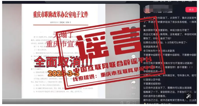 真相:近日,有网民在互联网平台发布消息称“重庆市宣布,申请评审的要求取消了很多条条框框,职称申请不看前置职称,全日制本科十年直接认定副高,不需要中级职称”,引发关注。经核实,网传信息系谣言。职称评审均需逐级晋升,取得上一级职称并满足相应学历资历条件后方可晋升高一级职称。目前重庆市除特殊人才、博士后等3个针对特定对象的职称申报绿色通道外,正常申报通道均需逐级晋升。网传文件是网民通过P图软件编辑而成,试图吸引不明真相的群众咨询,借机推销职称代办服务,收取高额费用。目前,谣言线索已转交公安机关进一步调查处置。(来源:“重庆辟谣”微信公众号)