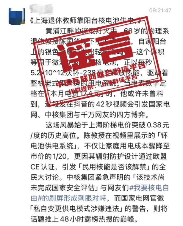 以上核查结果显示,这条“上海退休教授靠阳台核电池供电”的信息看似图文并茂、细节充分,却没有一张图片、一个细节经得起推敲核查。再从行文风格看,大概率是造谣者利用AI大模型生成。(来源:“上海网络辟谣”微信公众号)