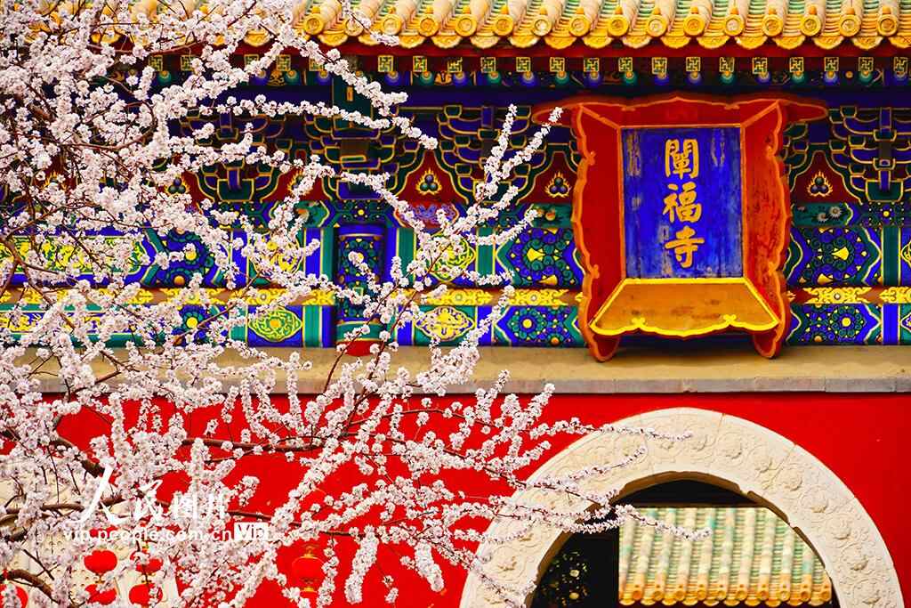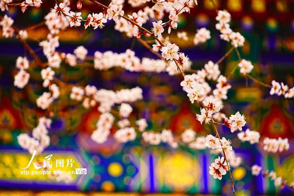 2025年3月13日,在北京的北海公园内,阐福寺旁的山桃花竞相盛开,粉白相间的花瓣在古朴建筑的映衬下,宛如一幅动人的春日风景画,美不胜收。宋家儒摄(人民图片网)