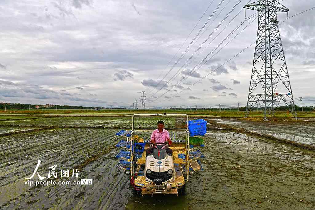 在海南省乐东黎族自治县黄流镇,农民们正驾驶着插秧机械在稻田中穿梭忙碌。当地积极抢抓农时,全力进行插秧作业,田间地头呈现出一派繁忙而有序的农忙景象。韩峻摄(人民图片网)