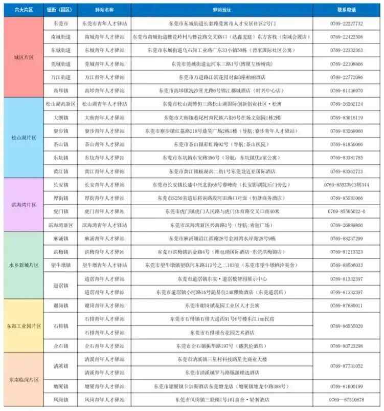 东莞市青年人才驿站为有意来莞就业创业的青年人才提供免费临时住宿、就业创业、政策信息推送和社会融入等一站式服务。其中,为高校应届生提供7天免费住宿,最长可延至15天。全市驿站信息如下: