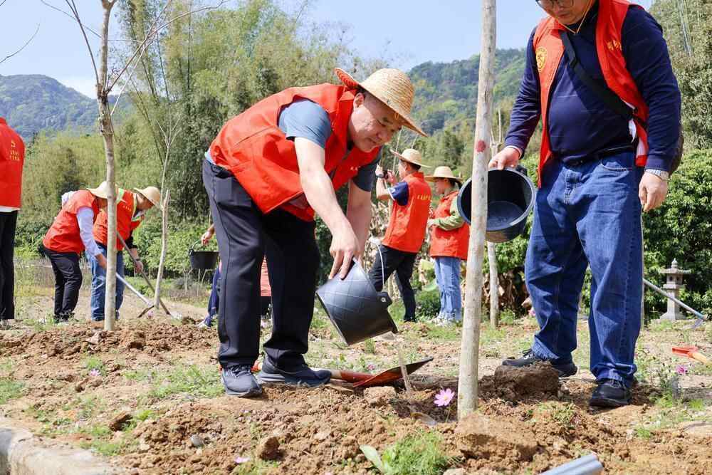 在南平村植树现场,昌岗街道党员干部、两新组织党支部代表与温泉镇南平村的党员、群众挥锹培土、提水浇灌,合力栽下近百株紫花风铃树苗,为乡村增添一片生机勃勃的“同心林”。